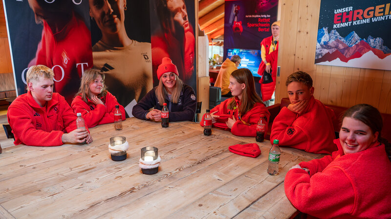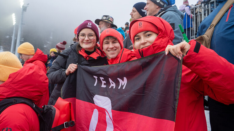 Rennrodlerin Julia Taubitz, die 2014 selbst am Olympischen Jugendlager teilgenommen hatte und bei den Olympischen Winterspielen 2026 Gold im Einsitzer und der Team-Staffel gewann, berichtete beim Skispringen der Männer auf der Großschanze von ihren Erinnerungen und gab den Jugendlichen inspirierende Ratschläge mit auf den Weg.